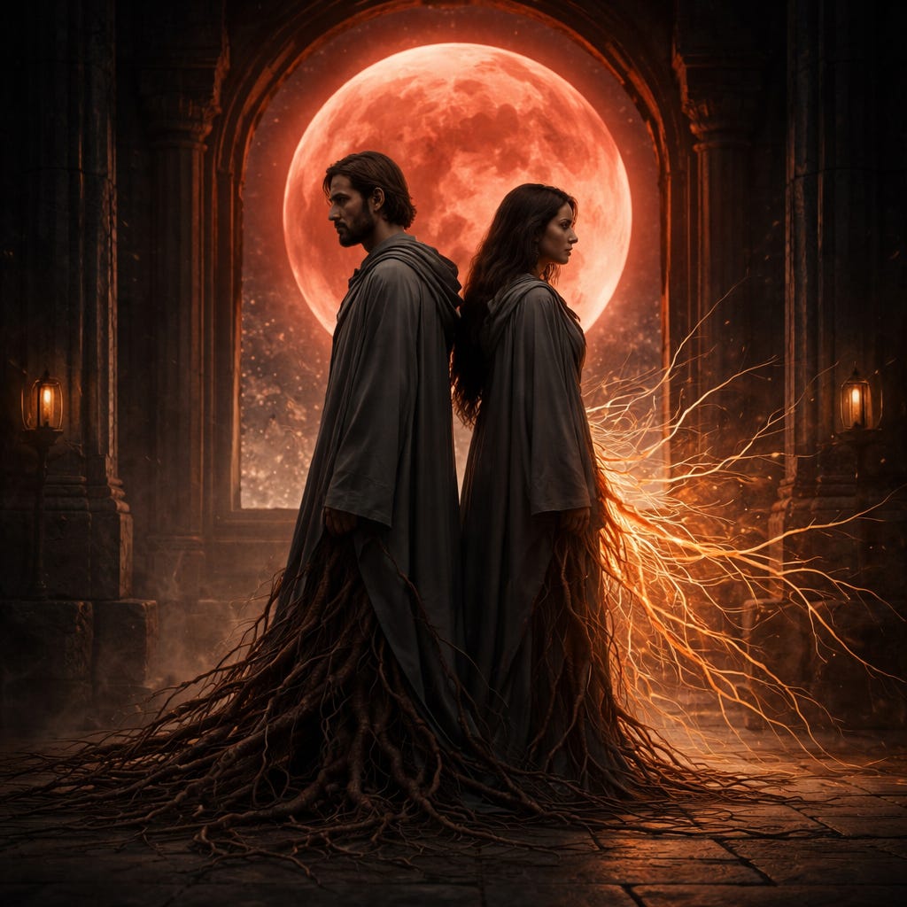 Scribes and shamanoids operate in dynamic tension under the Blood Moon.