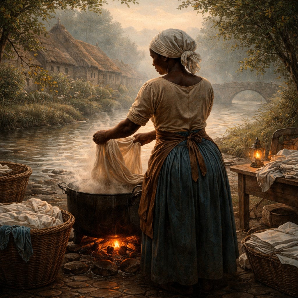 In a small village where the river bends, there lived a young Washerwoman who knew the world of steam and scrub, starch and press. Each dawn, she rose to light her washpot fire. Each night, she ironed until the stars blinked. Her brow knew sweat. Her hands knew the weight of wet clothes and the satisfaction of wringing fabric.