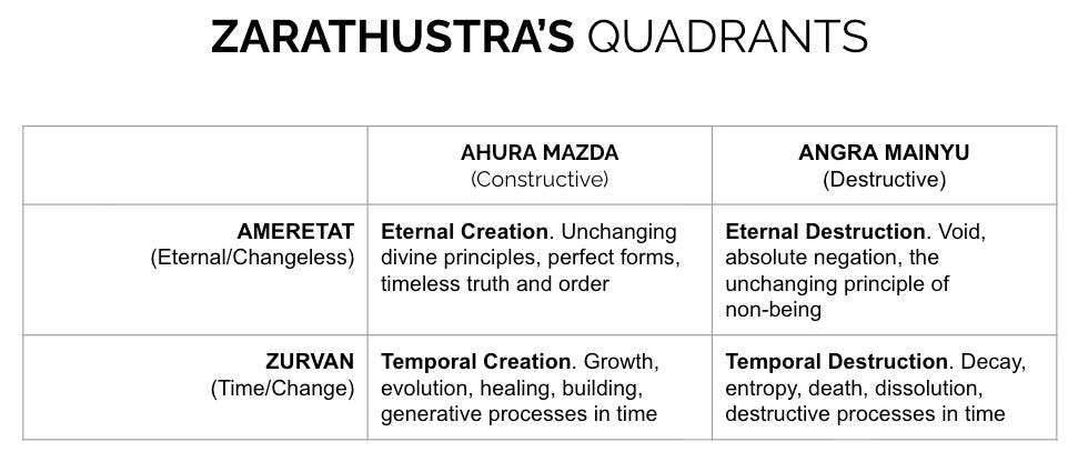 Drawing from Zoroastrian wisdom, we can construct a powerful framework for understanding the fundamental forces that shape existence and guide spiritual practice. By mapping two essential dualities onto perpendicular axes, we create Zarathustra’s Quadrants—a tool for discernment, self-examination, and conscious spiritual development.